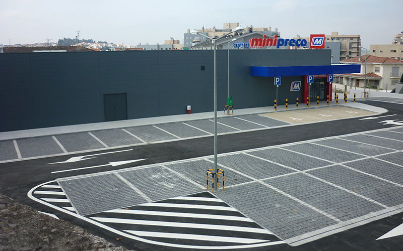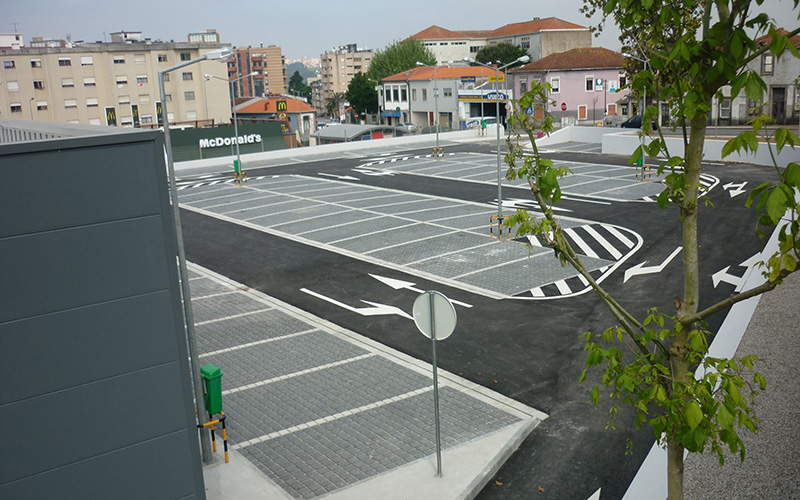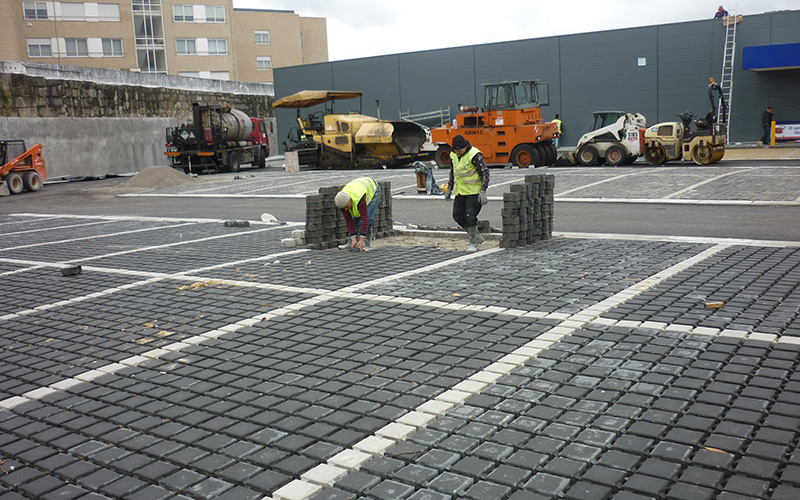 parque de estacionamento descoberto em betuminoso e zonas de estacionamento em PAVE, construção de jardins.