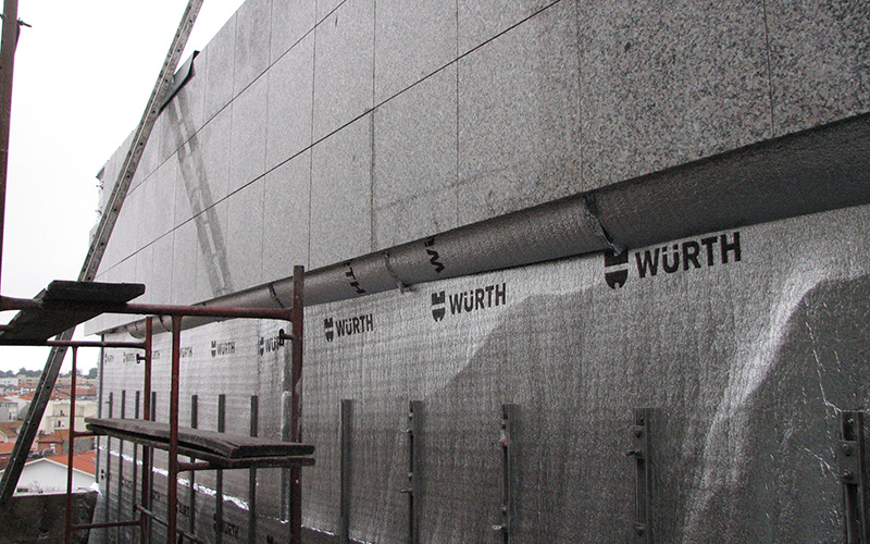 Natureza dos trabalhos: Impermeabilização e aplicação de isolamento térmico na cobertura. Reabilitação de fachadas com aplicação de argamassa com polímeros, isolamento térmico e aplicação de fachada ventilada com aplacado em pedra de granito. Substituição da caixilharia de alumínio existente.