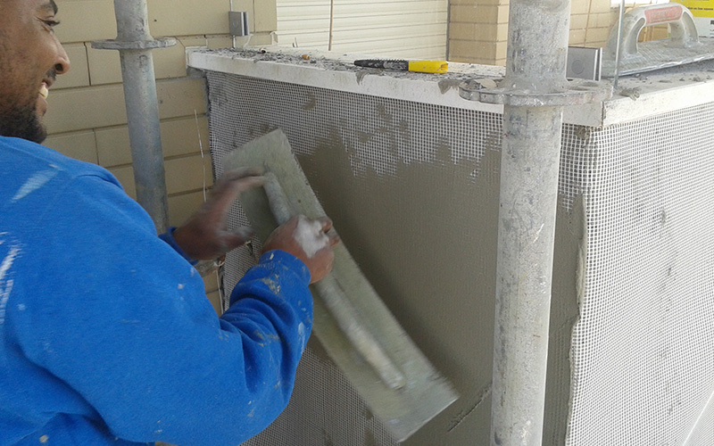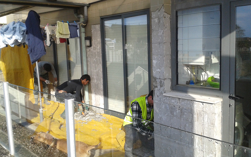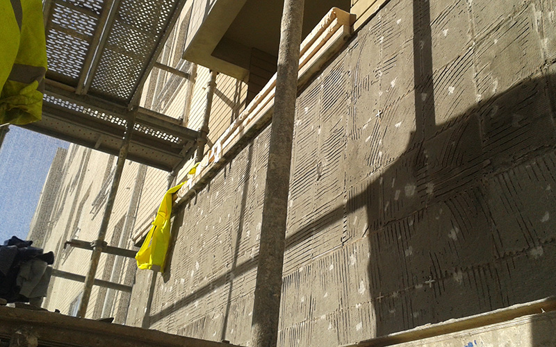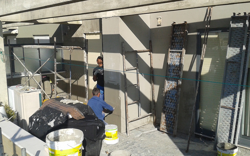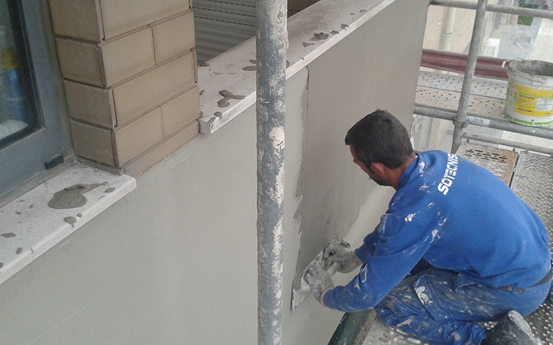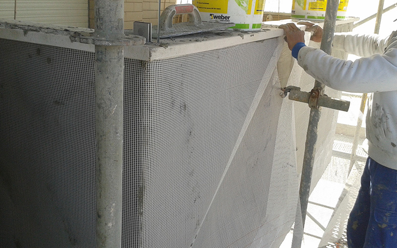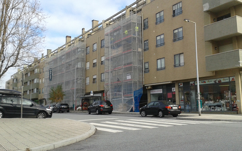 Natureza dos trabalhos: Remoção do revestimento cerâmico. Reabilitação de fachadas com aplicação de barramento armado com argamassa a base de polímeros reforçada com rede de fibra de vidro, isolamento térmico e aplicação de revestimento com barramento acrílico decorativo.